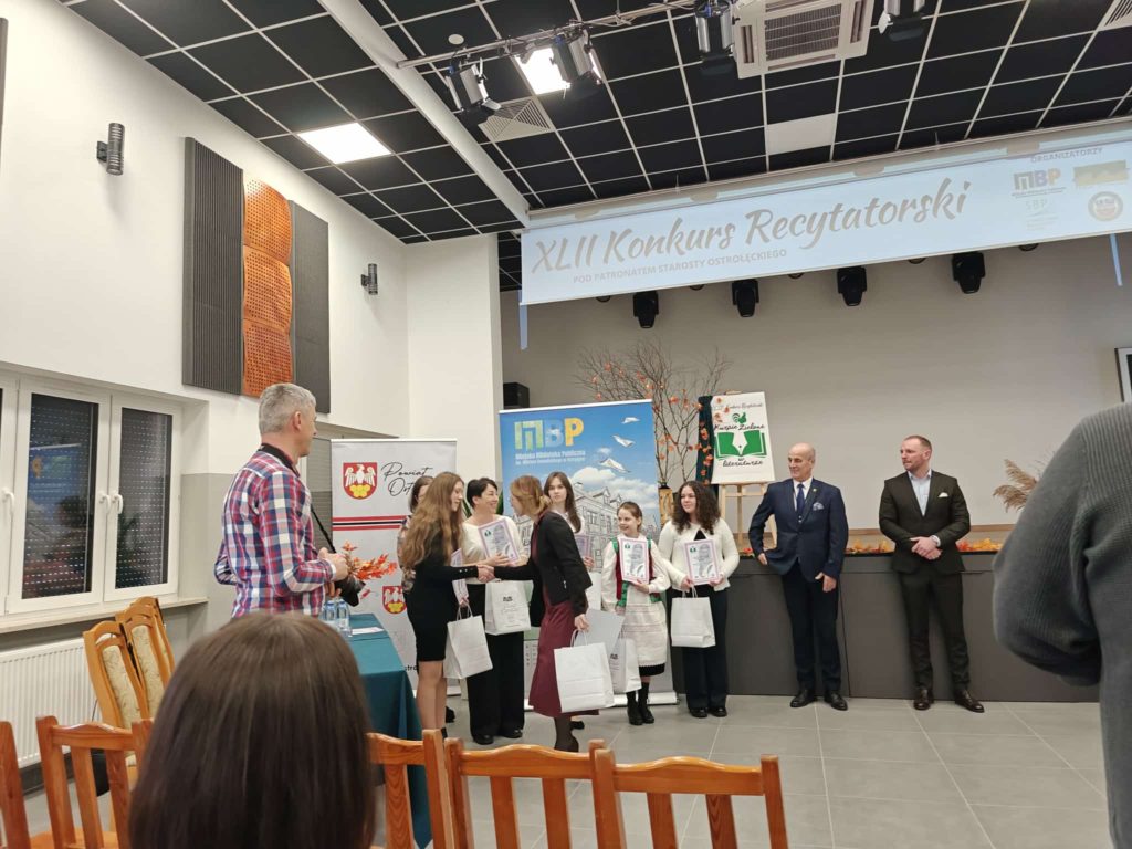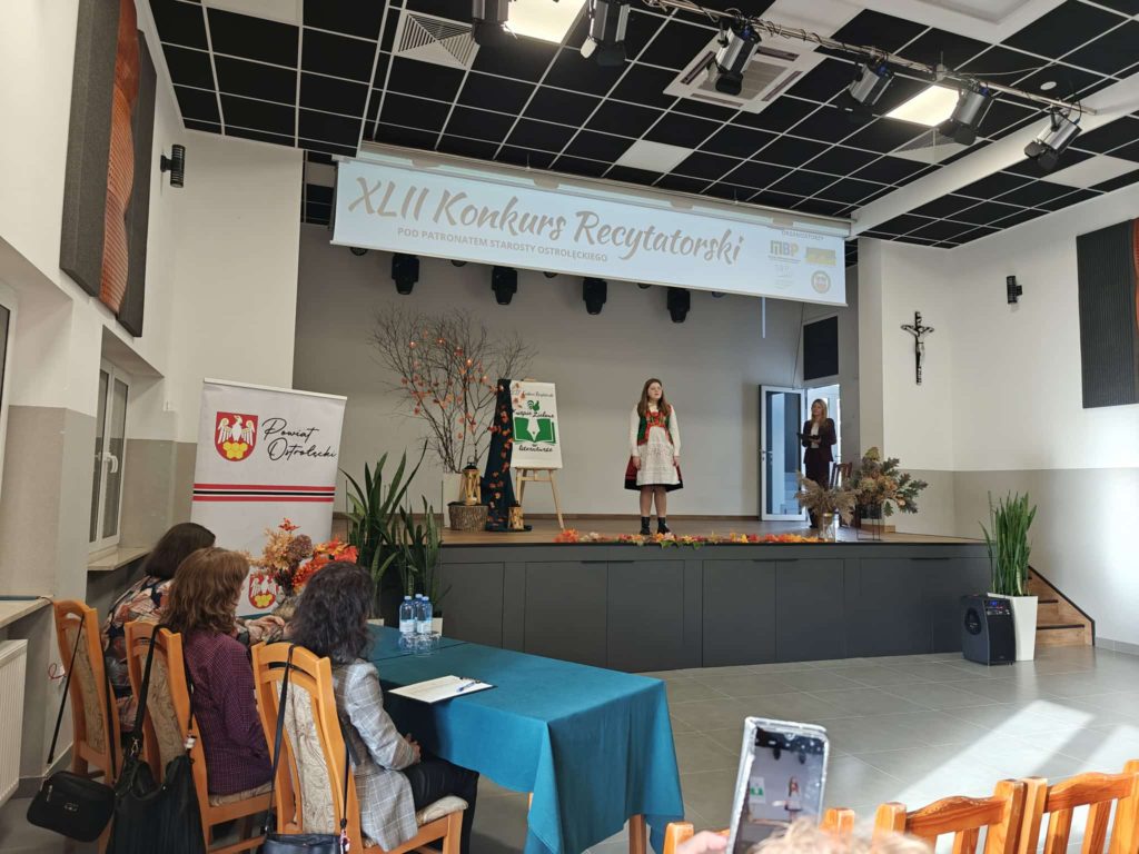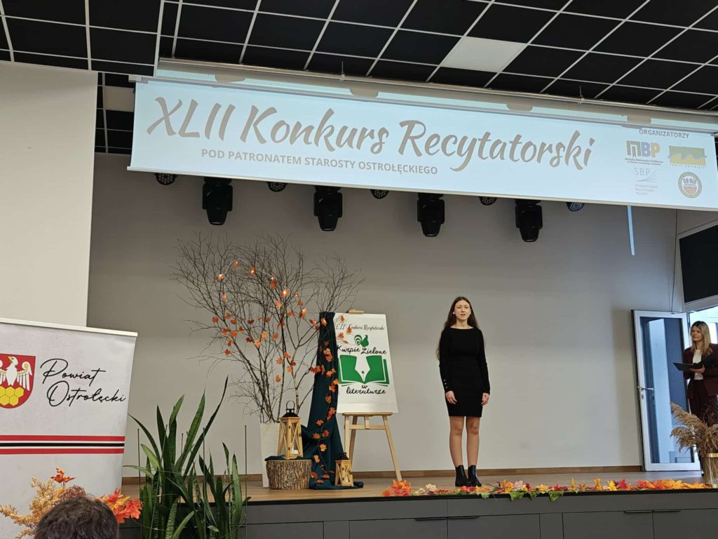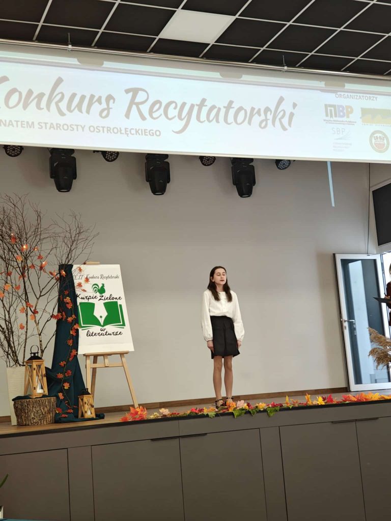 Szczególne gratulacje kierujemy do Aleksandry Kaczyńskiej, uczennicy klasy VIII, która podczas XLII eliminacji finałowych zdobyła III miejsce. Rywalizacja obejmowała uczestników z powiatów: szczycieńskiego, ostrołęckiego i łomżyńskiego, co sprawia, że osiągnięcie Aleksandry jest wyjątkowo wartościowe potwierdza jej talent recytatorski.