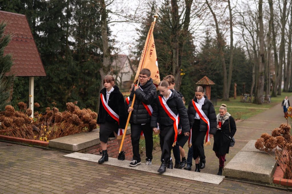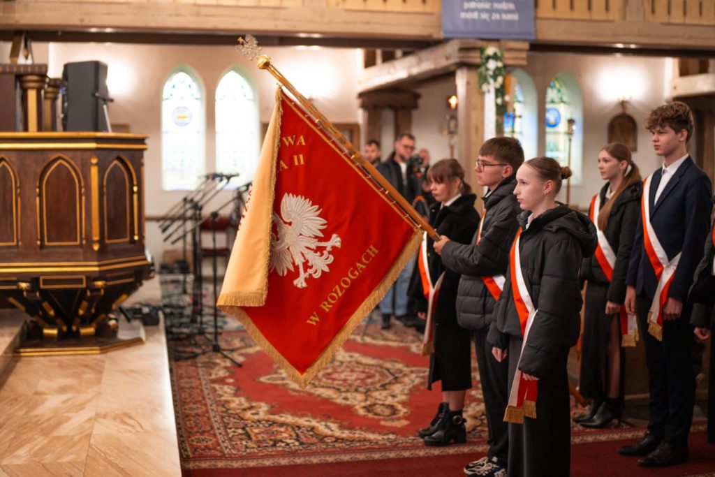 W dniu 11 listopada poczet sztandarowy naszej szkoły wziął udział w Uroczystej Mszy Świętej w Kościele pw. św. Marii Magdaleny w Rozogach, sprawowanej z okazji Narodowego Święta Odzyskania Niepodległości. Uroczystość miała podniosły charakter i zgromadziła liczne grono mieszkańców oraz przedstawicieli lokalnych instytucji. Po Mszy Świętej uczestnicy wysłuchali pięknego koncertu przygotowanego specjalnie na tę okoliczność. Następnie delegacje złożyły kwiaty pod pomnikiem „ZMARŁYM I POLEGŁYM W HOŁDZIE MIESZKAŃCY ROZÓG 1645–1995”, oddając hołd tym, którzy na przestrzeni dziejów oddali życie za Ojczyznę. Obecność naszego pocztu sztandarowego w tych uroczystościach była wyrazem szacunku, patriotyzmu i pielęgnowania pamięci o ważnych wydarzeniach historycznych.