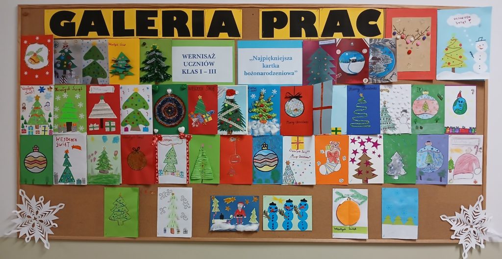 To już świąteczna tradycja, że w naszej szkole organizowana jest wystawa pt. „Najpiękniejsza kartka bożonarodzeniowa”. W tym roku uzdolnione plastycznie dzieci z klas I – III wykonały 43 wspaniałe prace. Piękne, oryginalne, ciekawie ozdobione i wykonane różnymi technikami kartki zostały zaprezentowane w szkolnej galerii. Wszyscy autorzy prac plastycznych otrzymali dyplomy i drobne upominki.